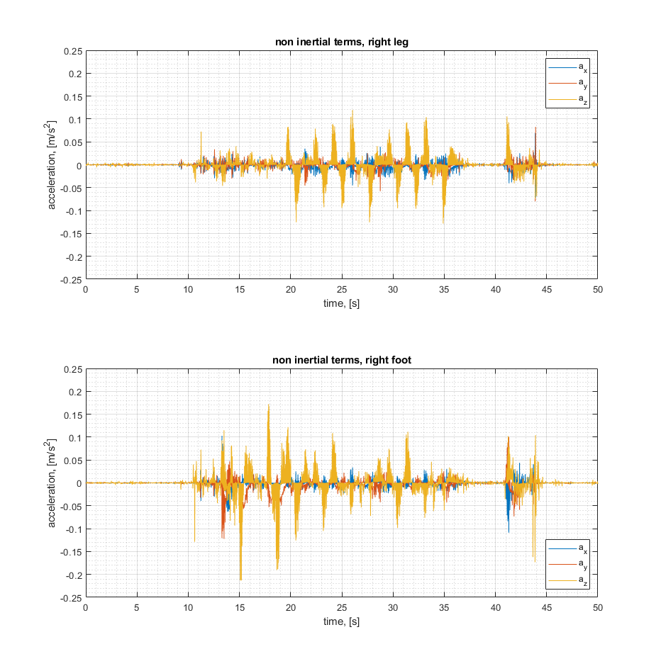 To assess the required level of precision in transforming the acceleration between the two dragged reference frames, we performed a few tests in a real world case, i.e. the iCub performing the Yoga Demo. In this demo the left foot is held on the ground and the robot balances over it moving the right leg. We logged both gyroscope and accelerometer data from all the F/T sensors and evaluated the non-inertial terms from the formula above.