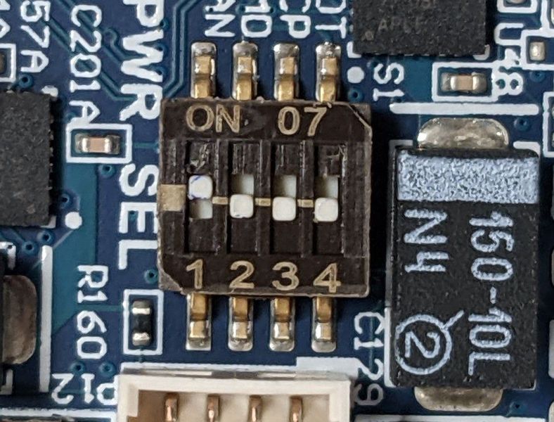 Each carrier board could be equipped with different switches that should be set at the startup. For example, for the Rogue carrier, make sure that the switches on the carrier are set like in the picture below, so that the unit can boot manually when pressing the power (PWR) button. DO NOT power on the unit until instructed.