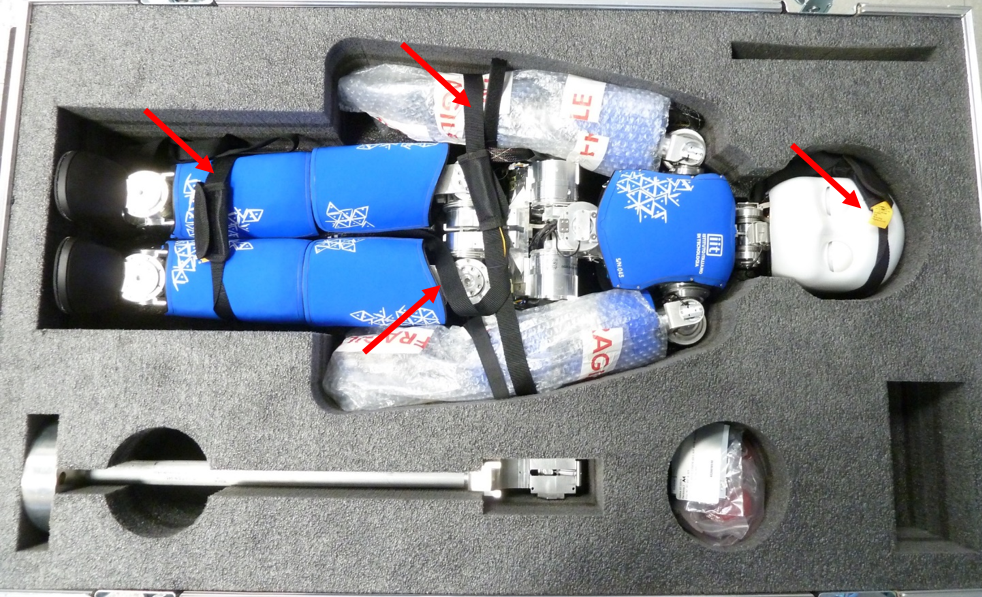 In order to remove iCub from its box, first remove the black straps holding the robot.