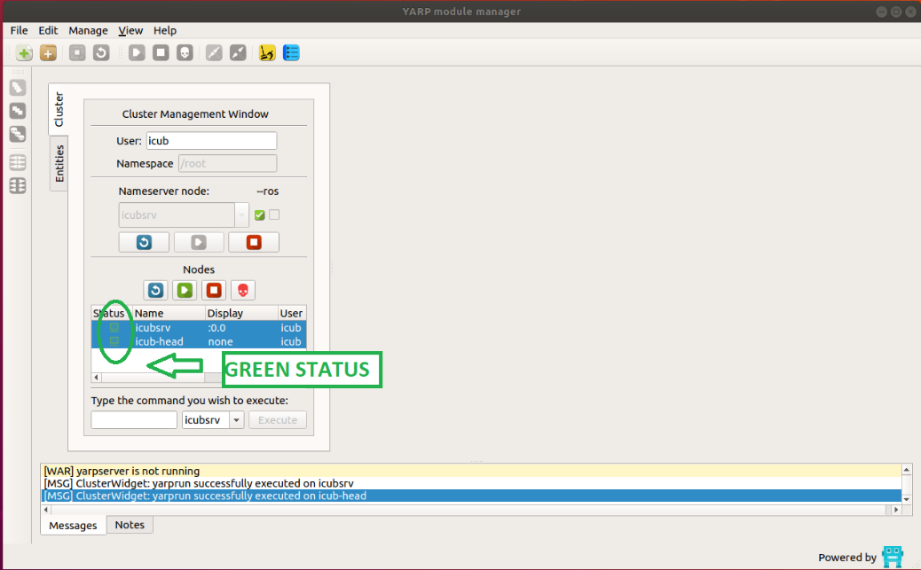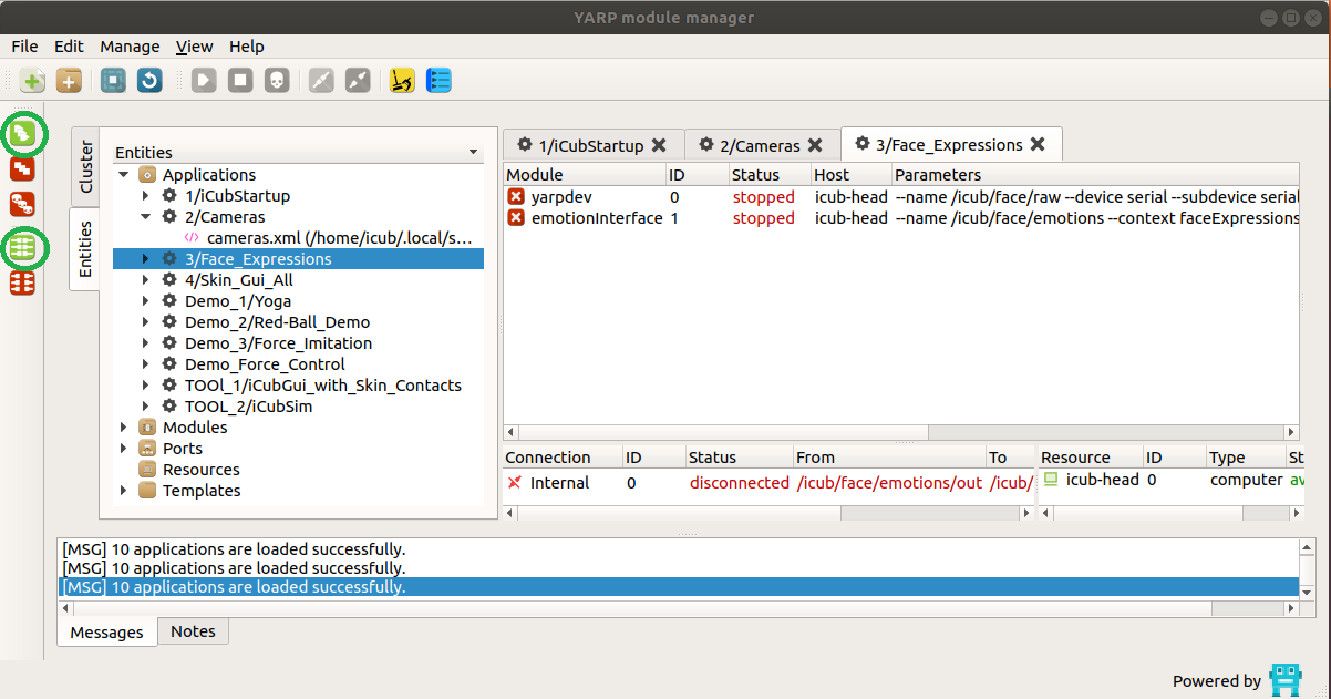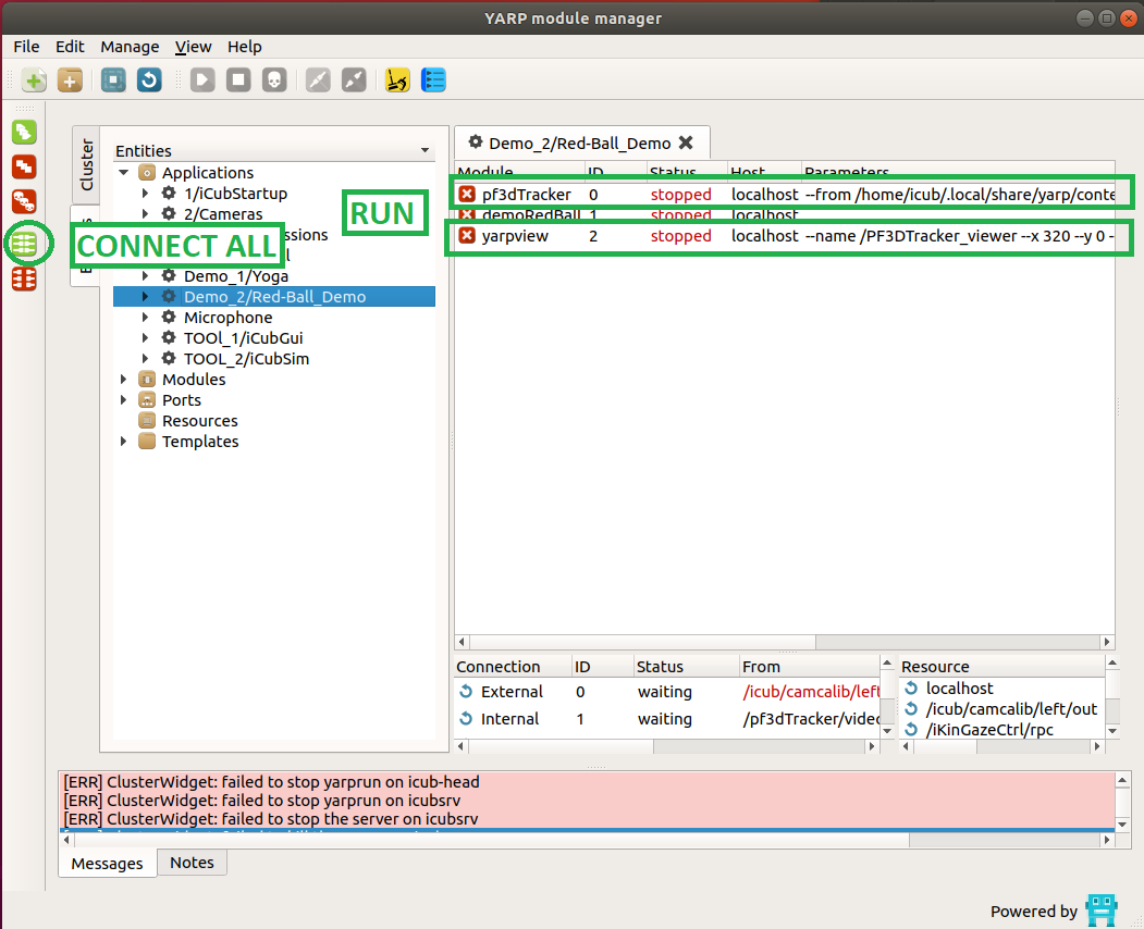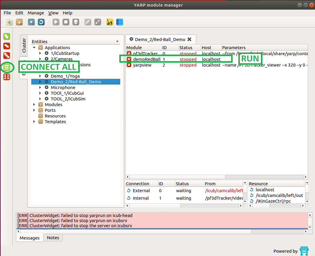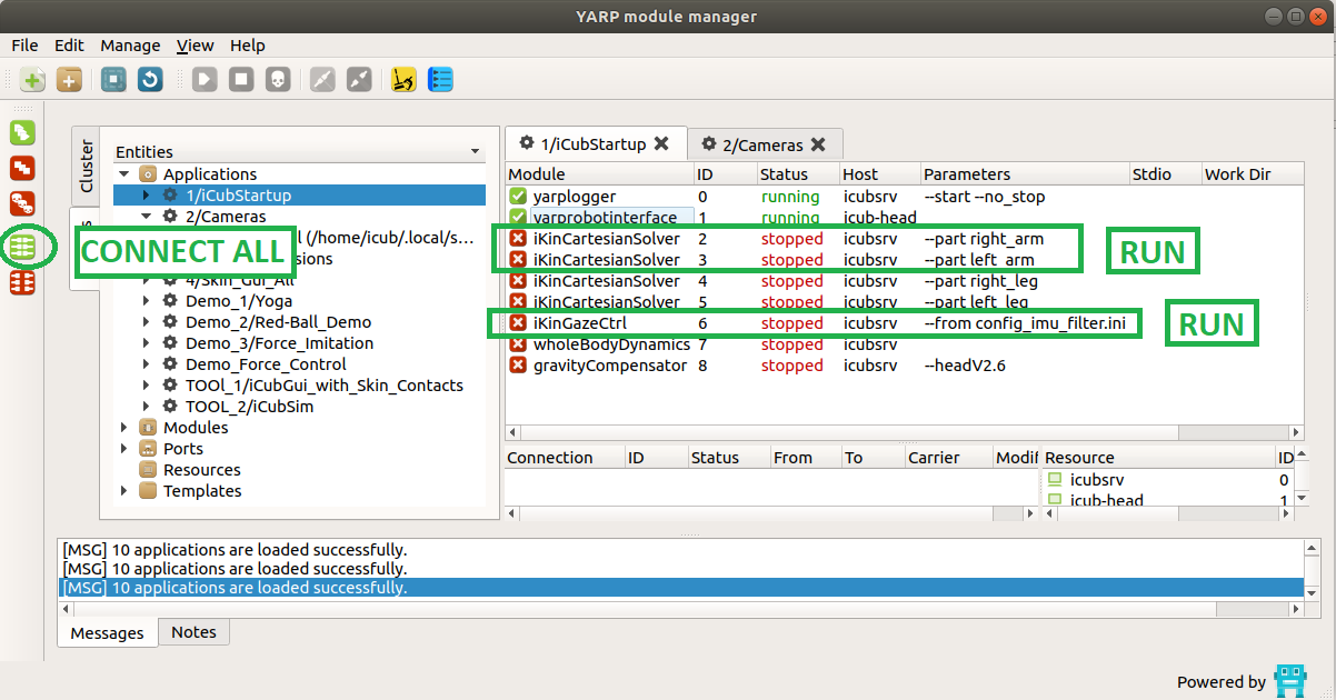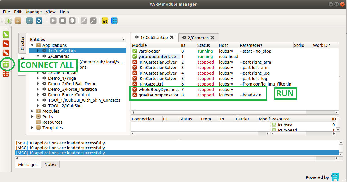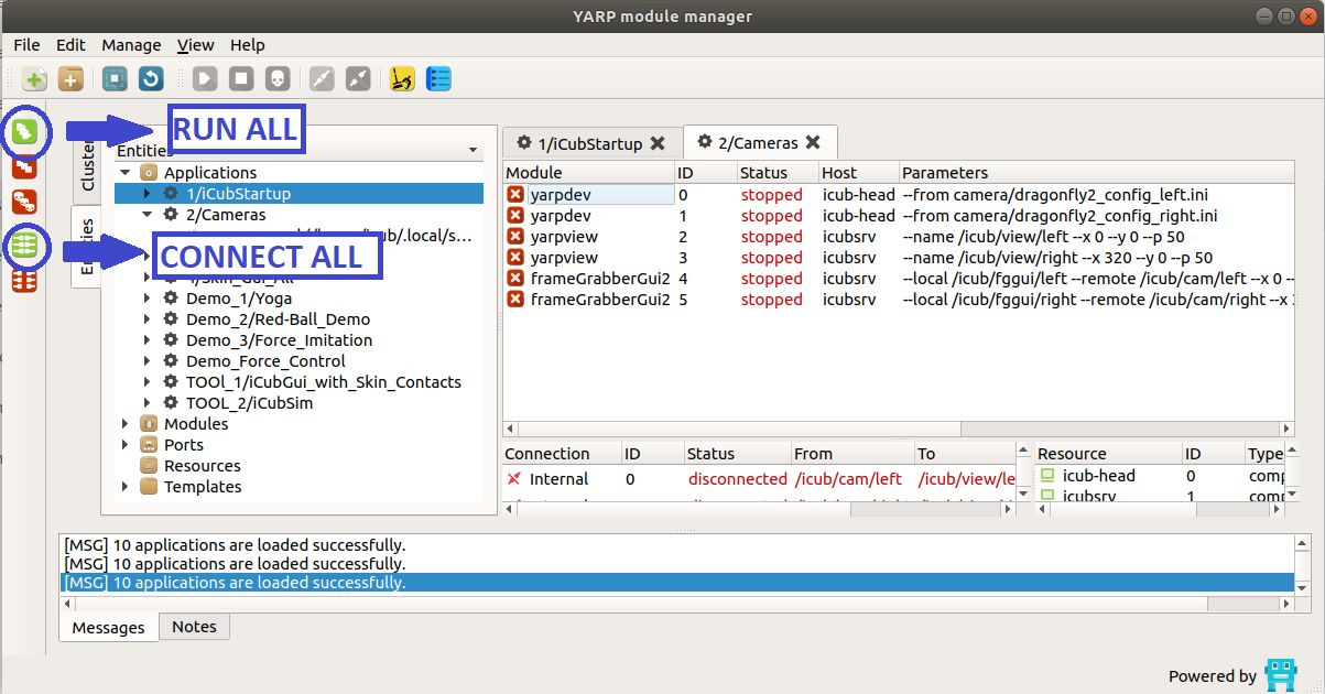 - click on the icon RUN ALL on the left side of the yarpmanager GUI