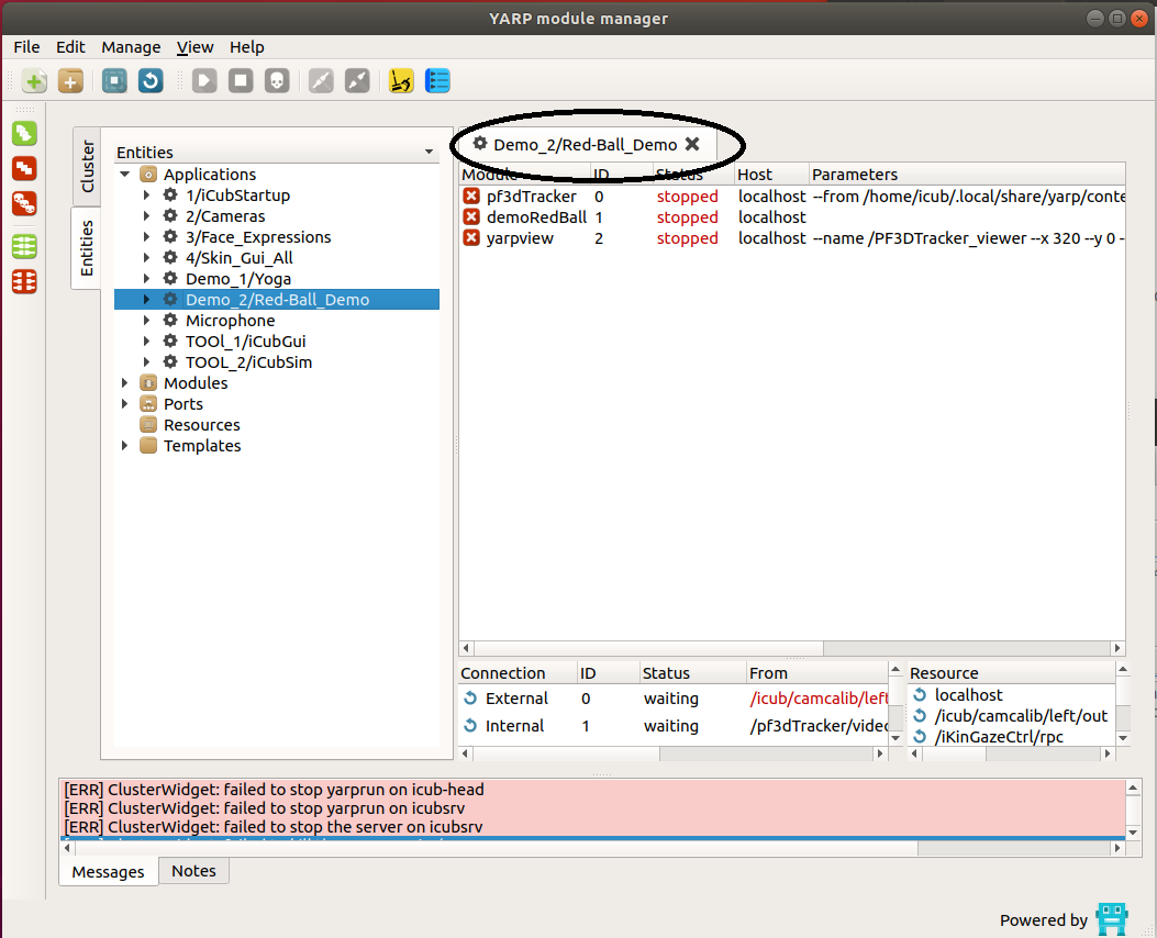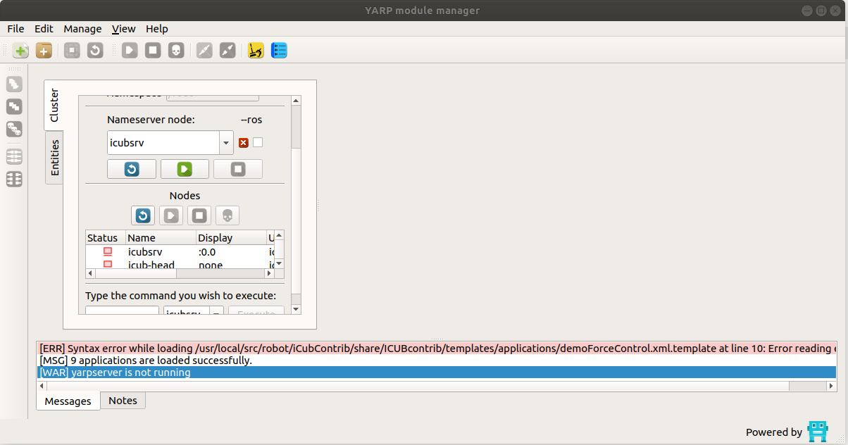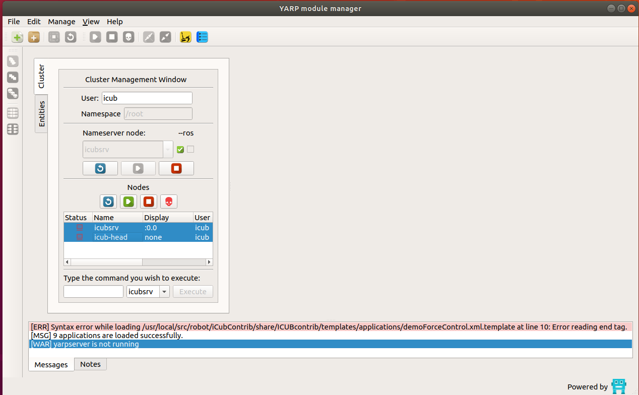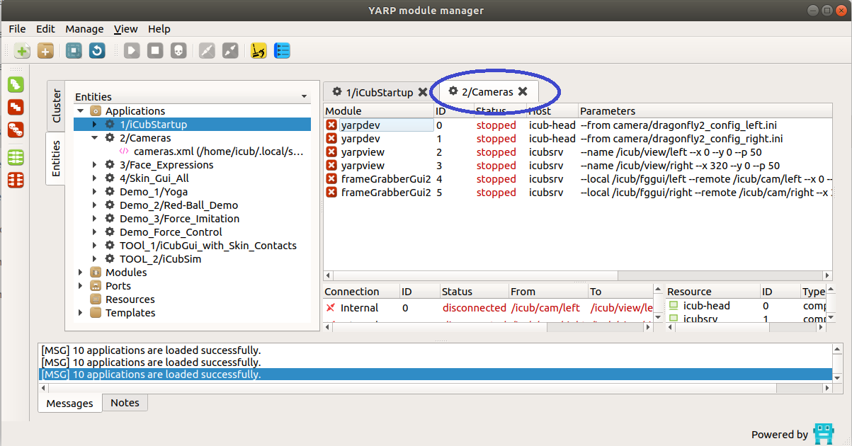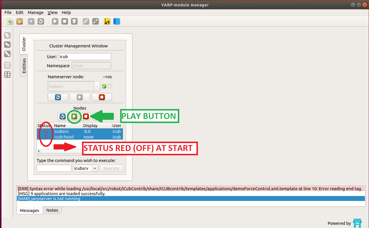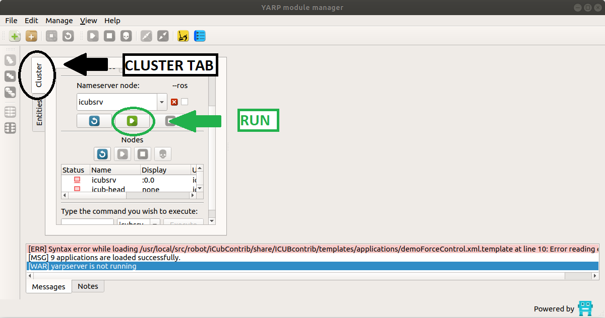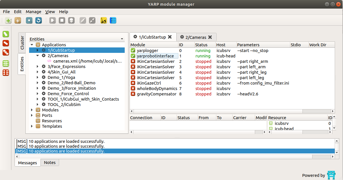 - click on the icon RUN ALL on the left side of the yarpmanager GUI