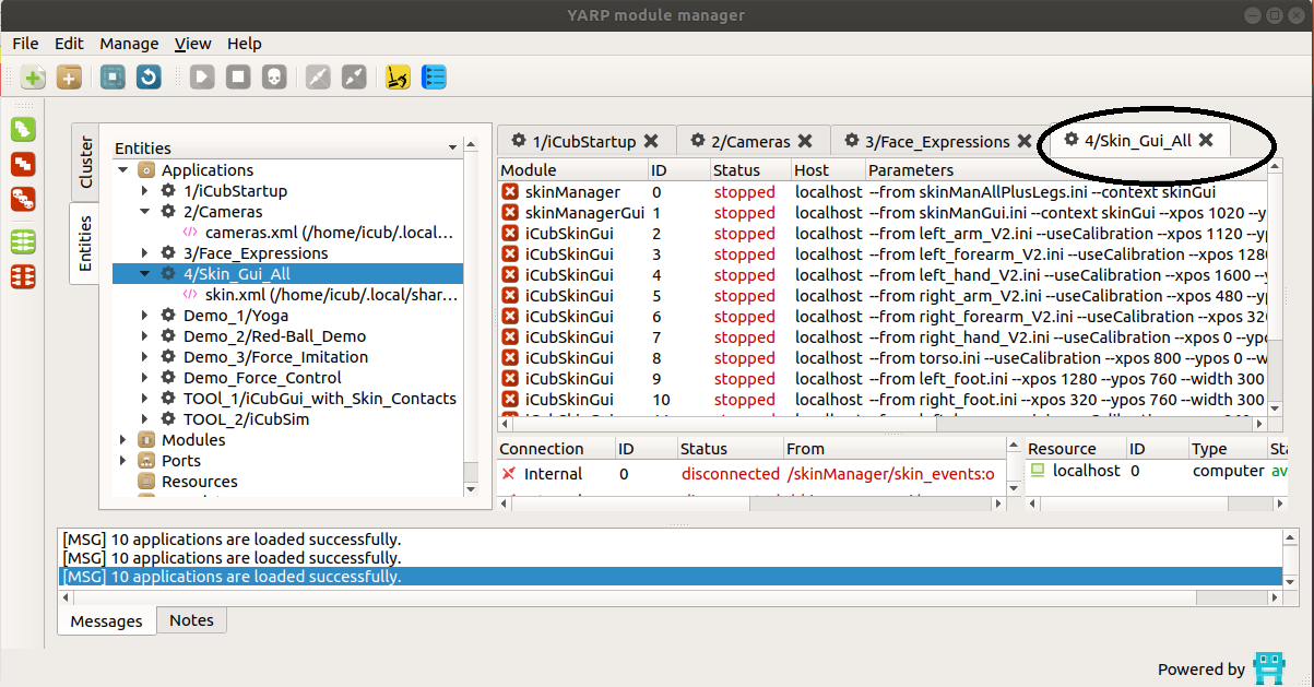 Once done using the robot (to do not over use the CPU for the server side– icubsrv – please close the applications – by clicking on DISCONNECT ALL and STOP ALL for the applications skin)