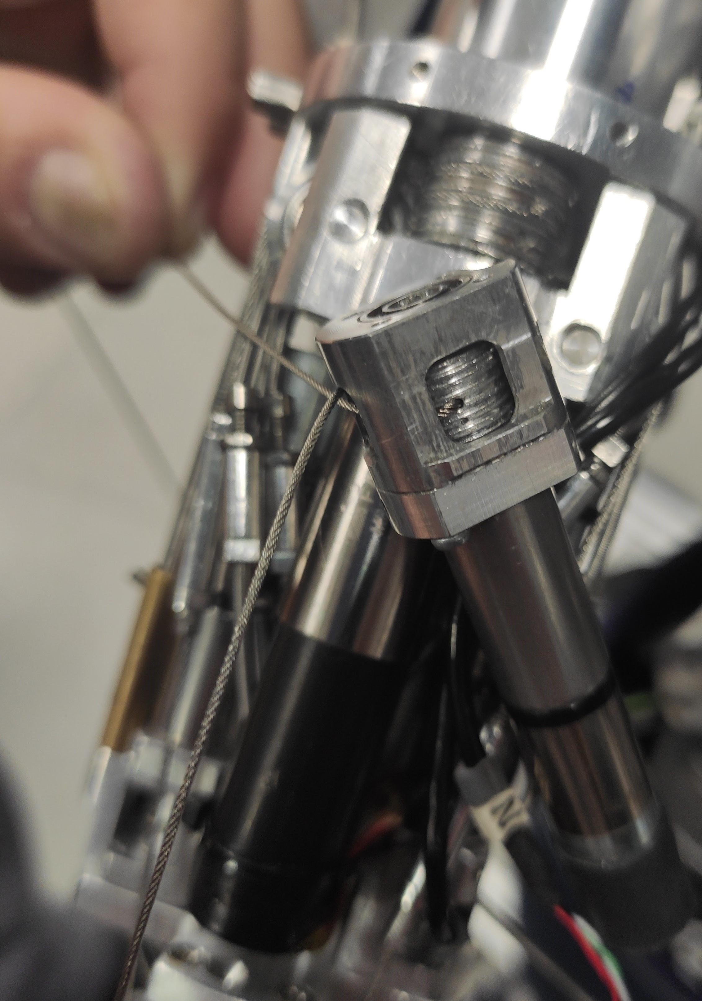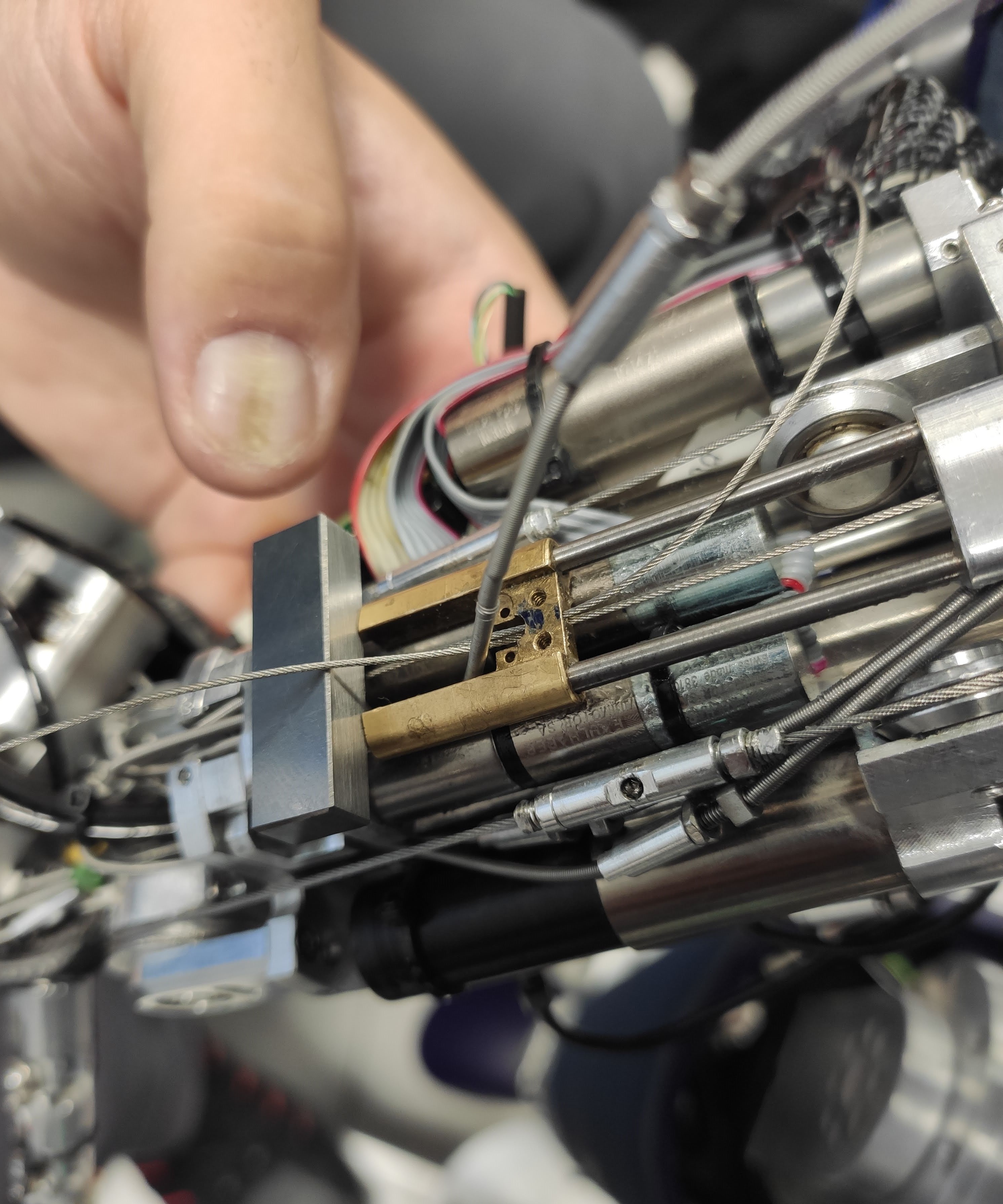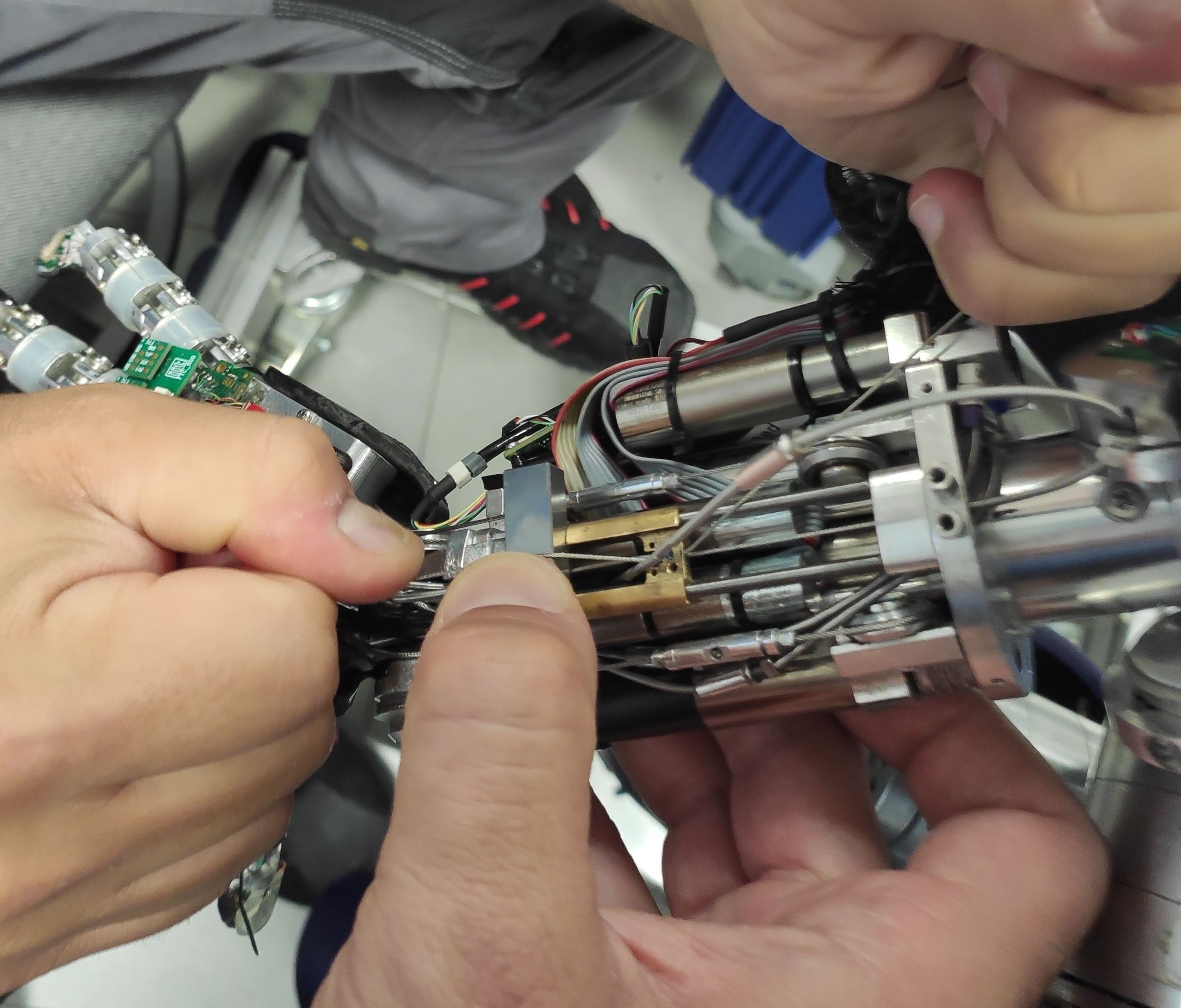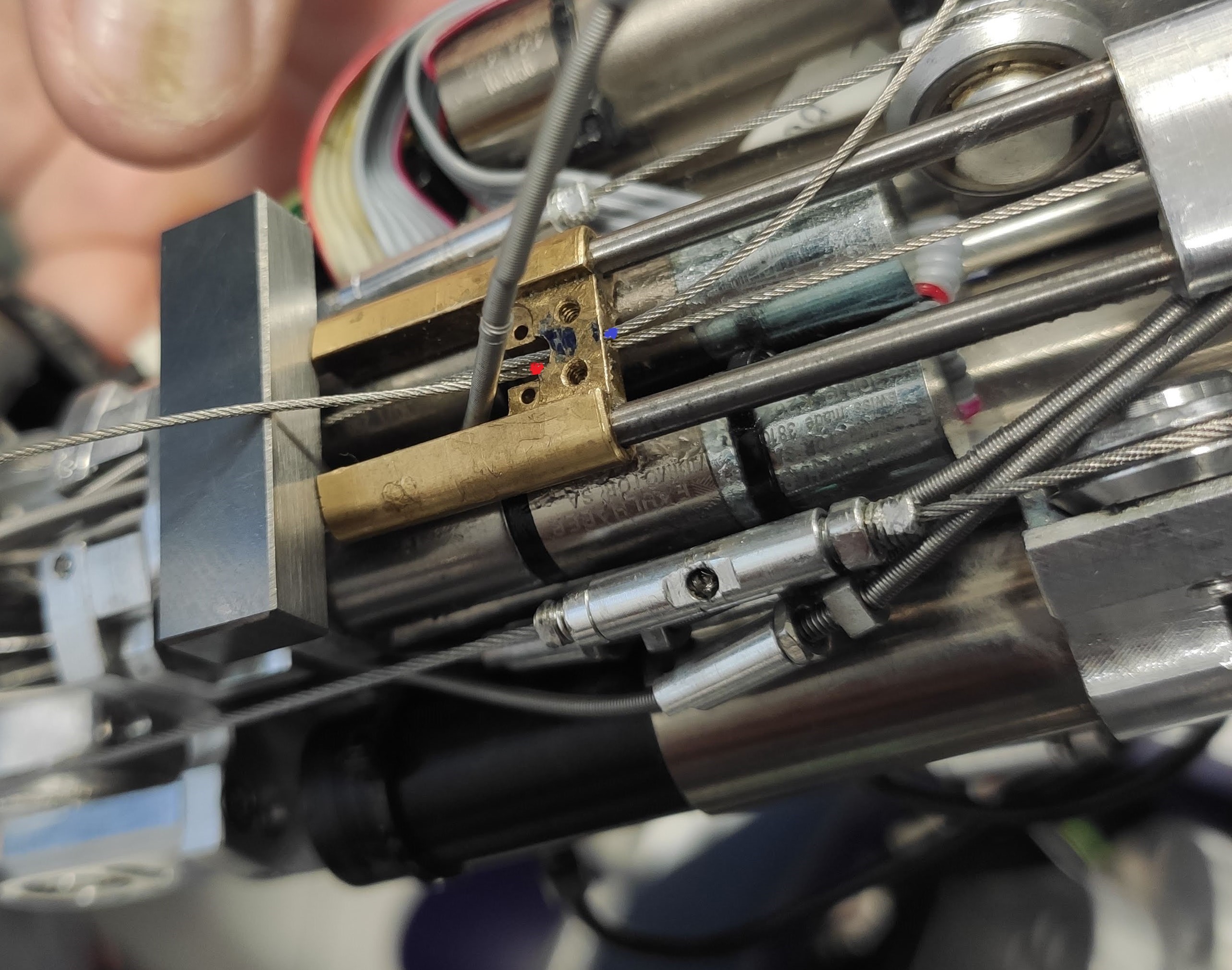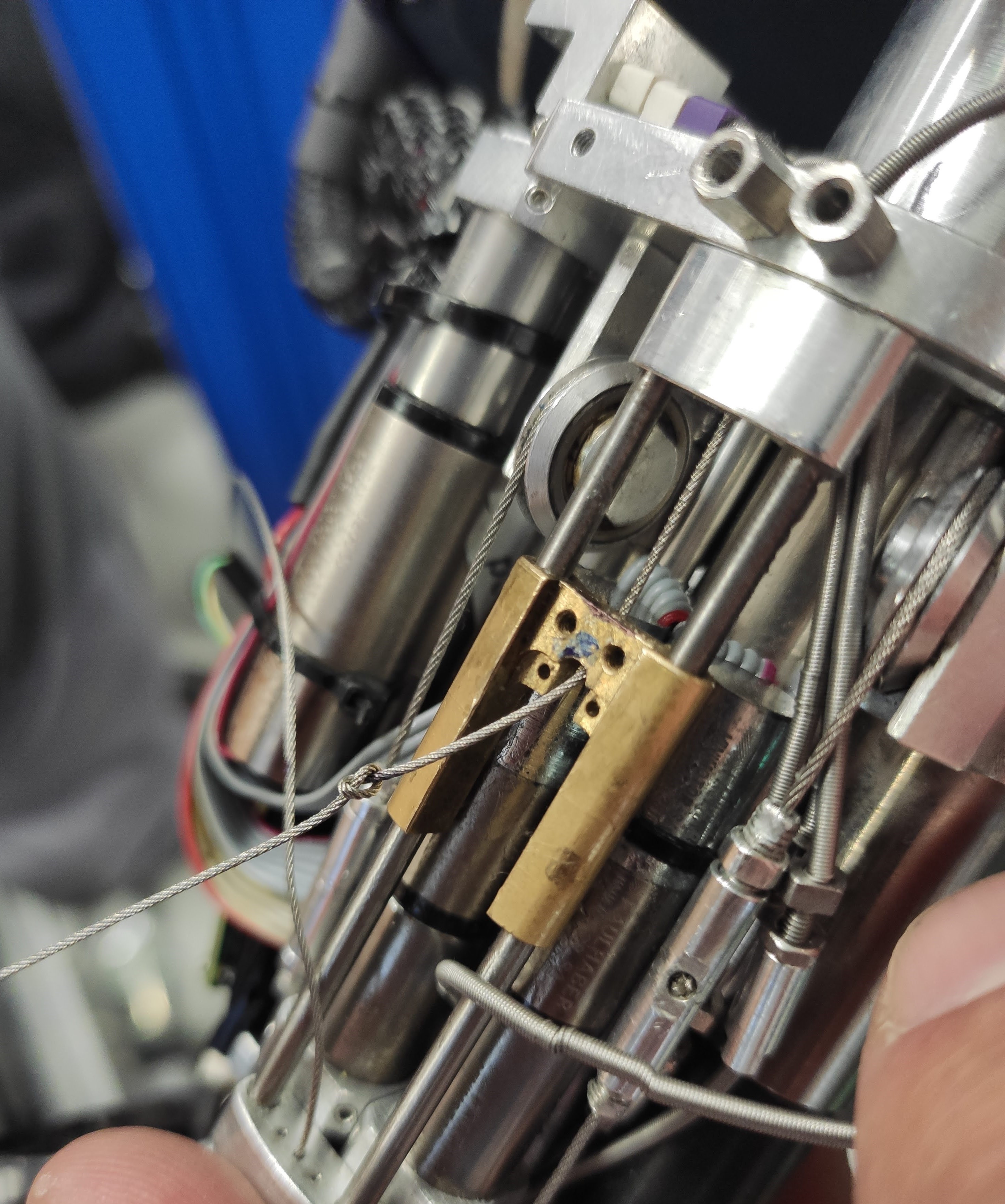 The final cabling is tricky. First, remember to CLOSE the tensioner of each cable before starting the cabling. If you leave the tensioners open, the cabling will not work. For making the final knot, put a mark on the blue cable and knot it. Slowly turn the motor CCW/CW while pulling the red extremity, ensuring that the cable is correctly running on the motor pulley. When the finger is completely closed pull the red cable and put a mark where the knot will be. Proceed by making the knot the closest to the mark. Finally, you can use the tensioners for removing the slack.
