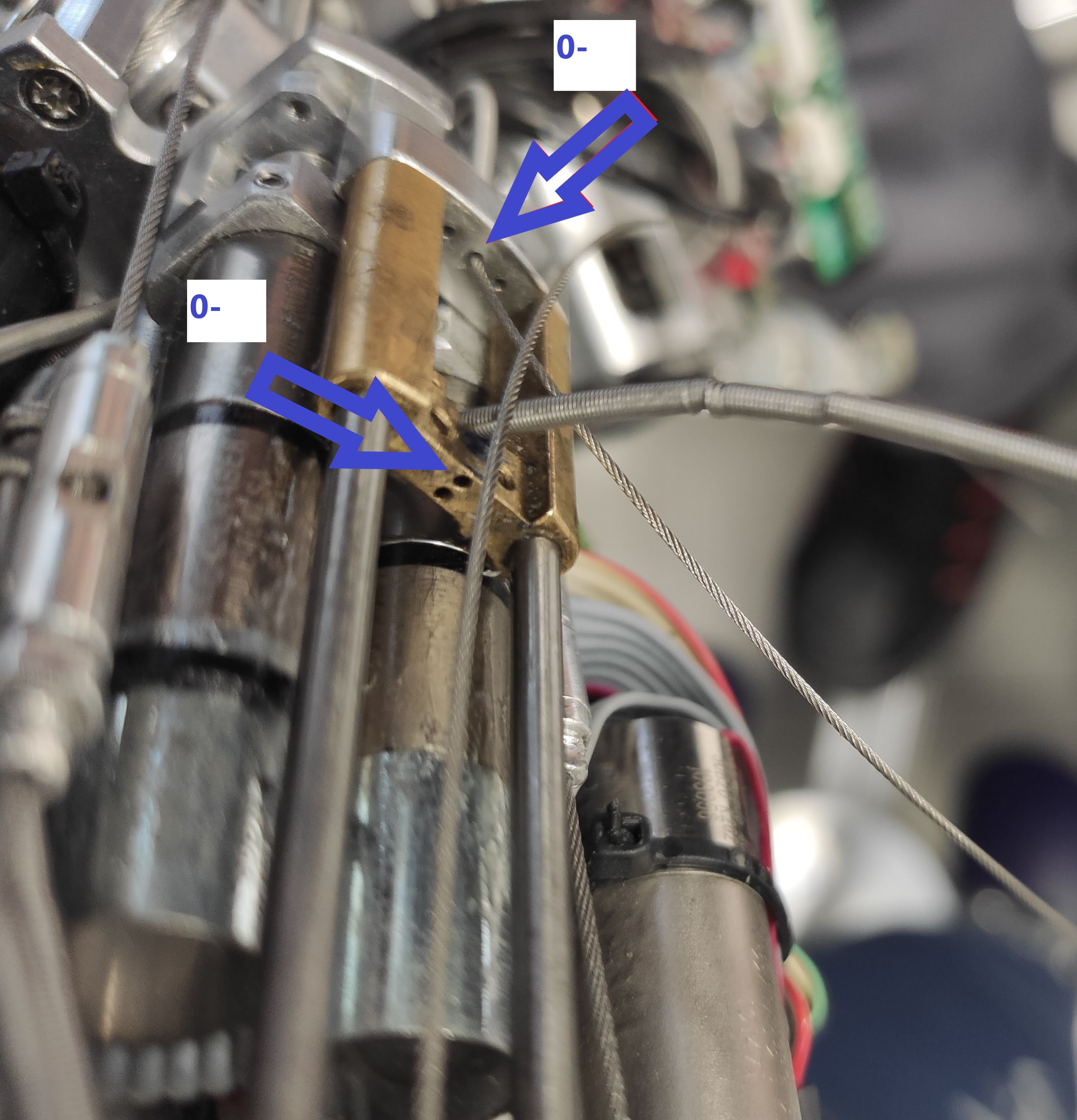 Detail of the slide in position 0 with the cables 0+ and 0- passed through the holes. |