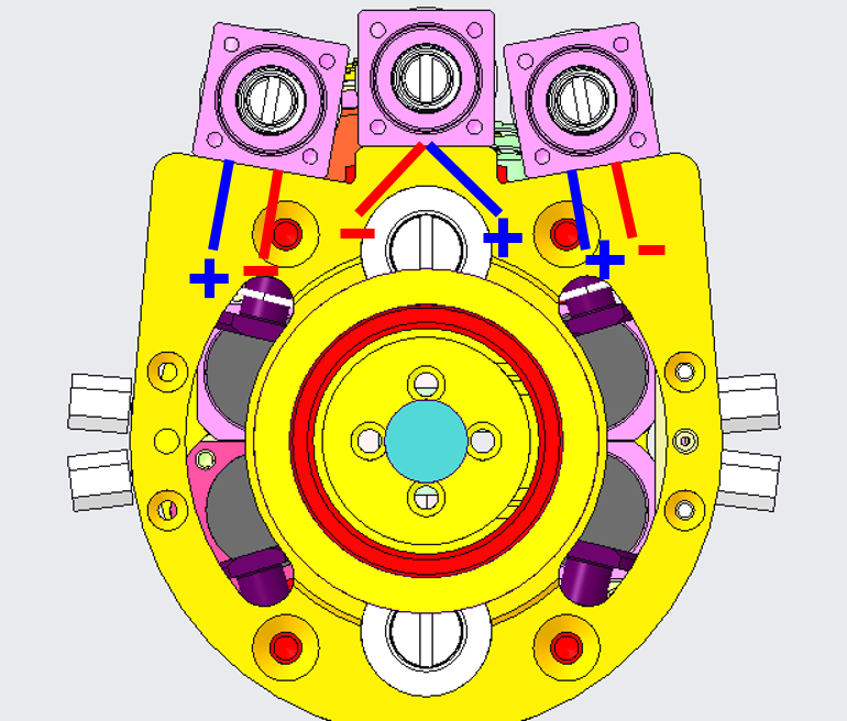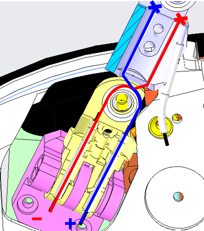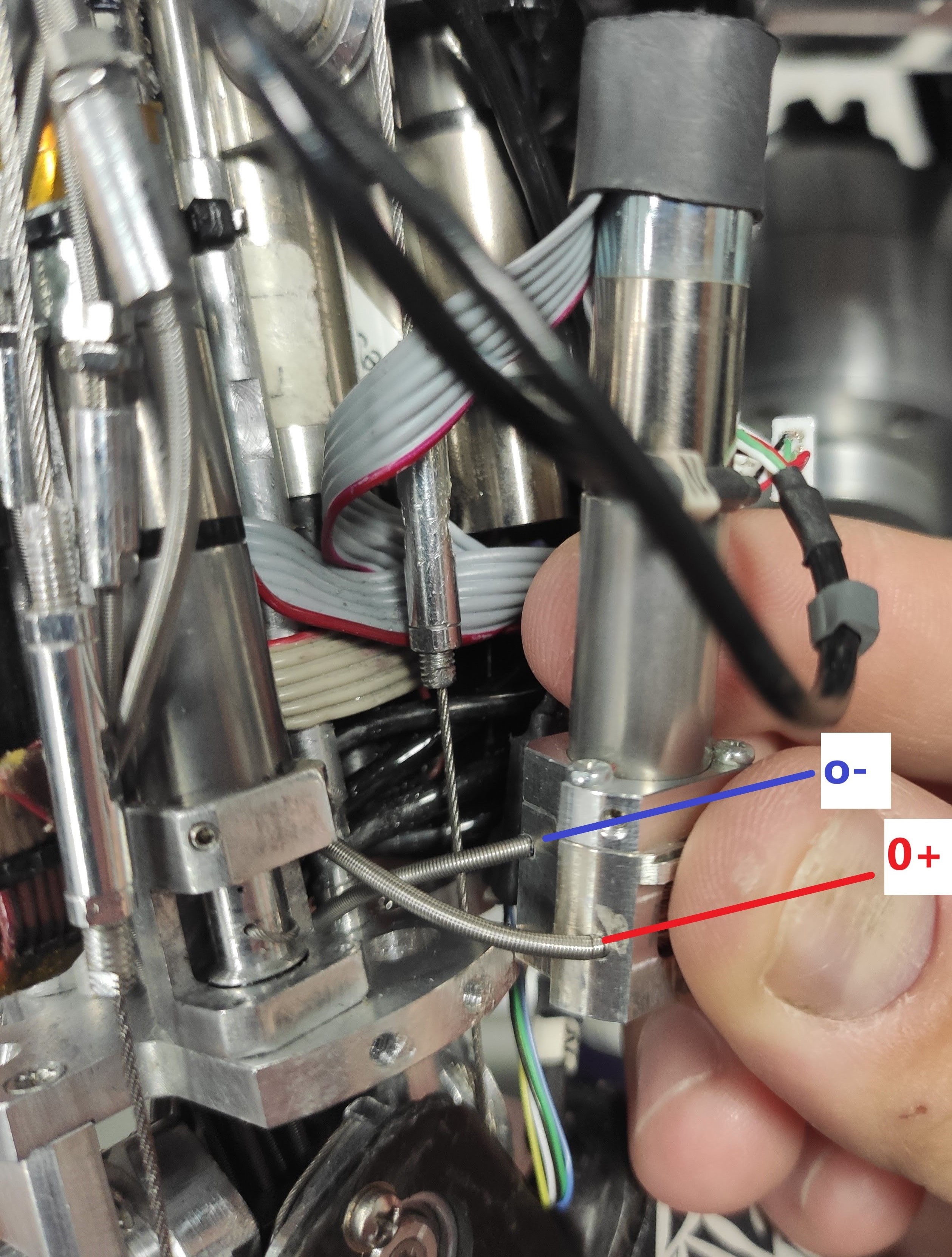 Insert the 1815 cable in the sheaths 0+S (ball bearing side) and 0-S (motor side). The blue one is 0-S sheath and the red one is 0+S. |
