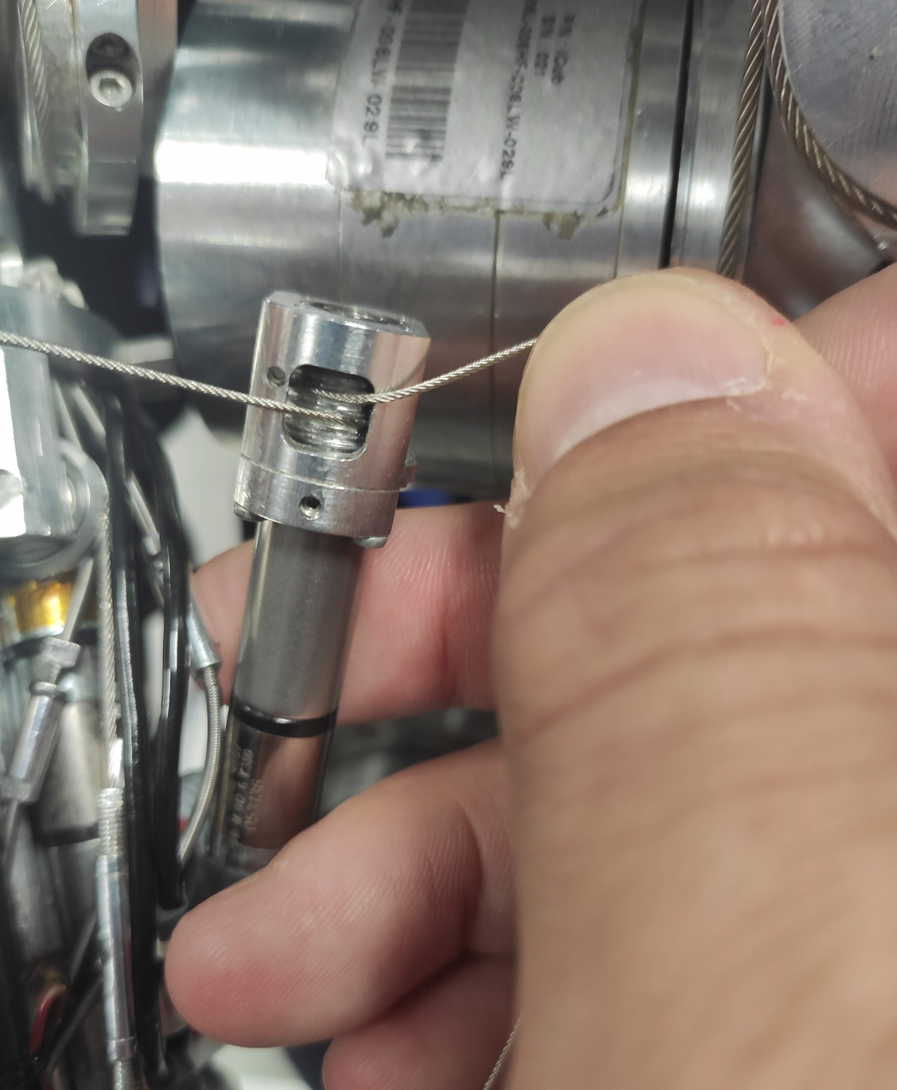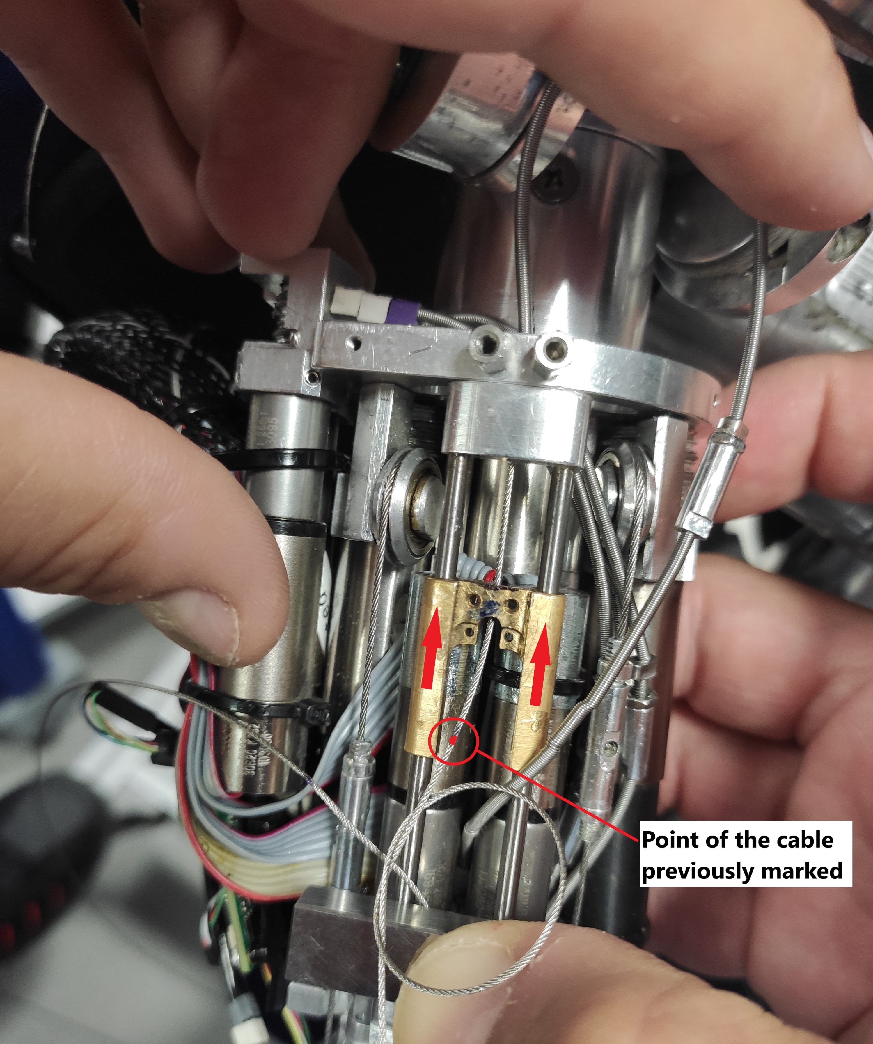 | 7. Now close manually the 2 fingers to get some slack to the cable and pull it out a bit to see where you should create the knot - at the very end of the mark on the cable. | |