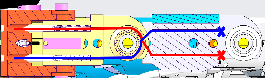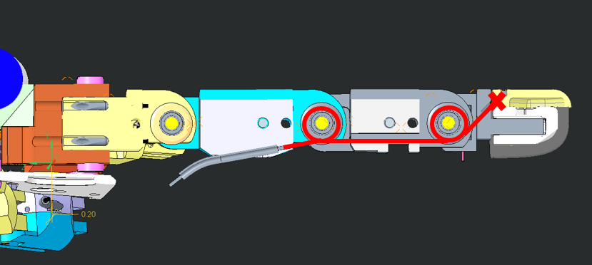 | From the base of the phalange, insert the cable in the two pulleys following the path (red), ensuring that the cable remains parallel while looping (see bottom picture). | |