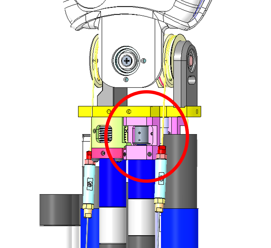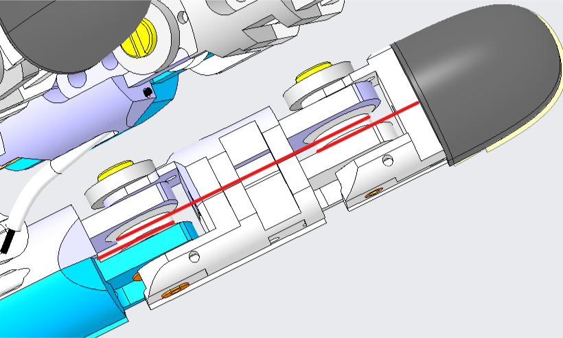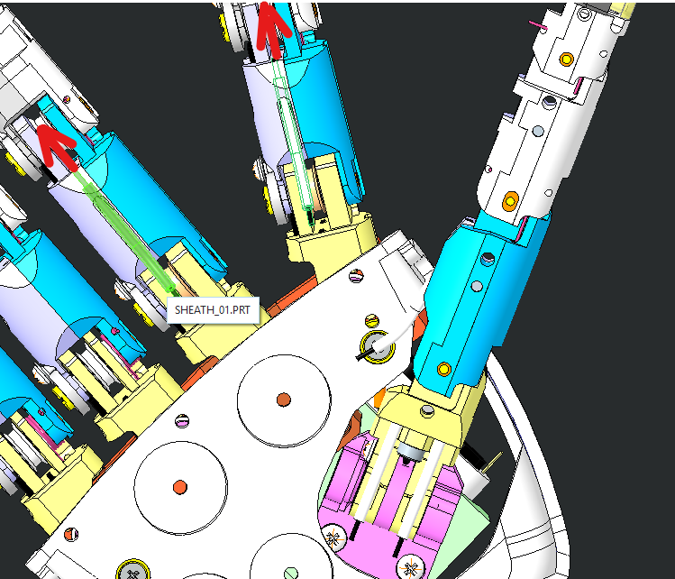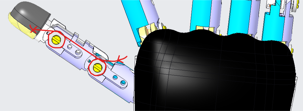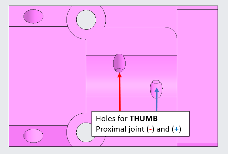 | For the thumb, the frame holes are designed inclined by 45 deg, therefore the cables will not enter the frame perpendicularly as the previous case. | |