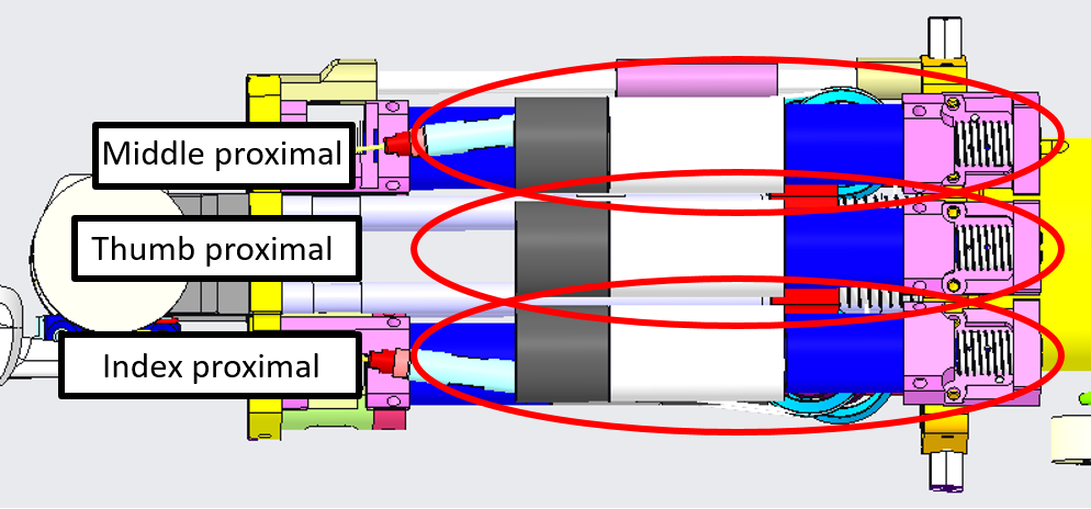The start of the wiring for each proximal is identical (wiring around the motor pulley), the index and middle proximal joints are cabled exactly the same way, just the thumb is a bit trickier.