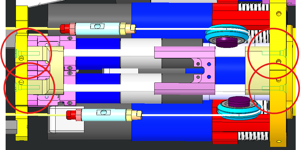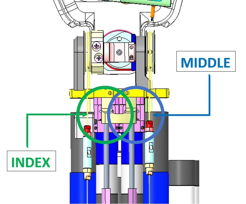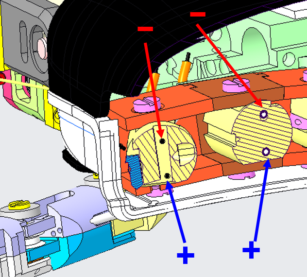 After having removed the screws you should be able to move sideways the slider, being able more easily to fit the cable into the retaining socket, but mainly see both internal holes (blue circle for middle distal and red circle for index distal). |