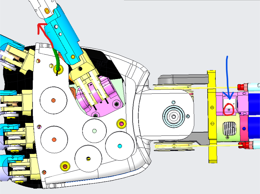 In order to recable this joint, just insert the new cable IN side the hole (red circle - blue arrow) - the hole is in the internal side of the pulley cage. Once inserted, the cable should get OUT at the base of the phalange (red arrow). |