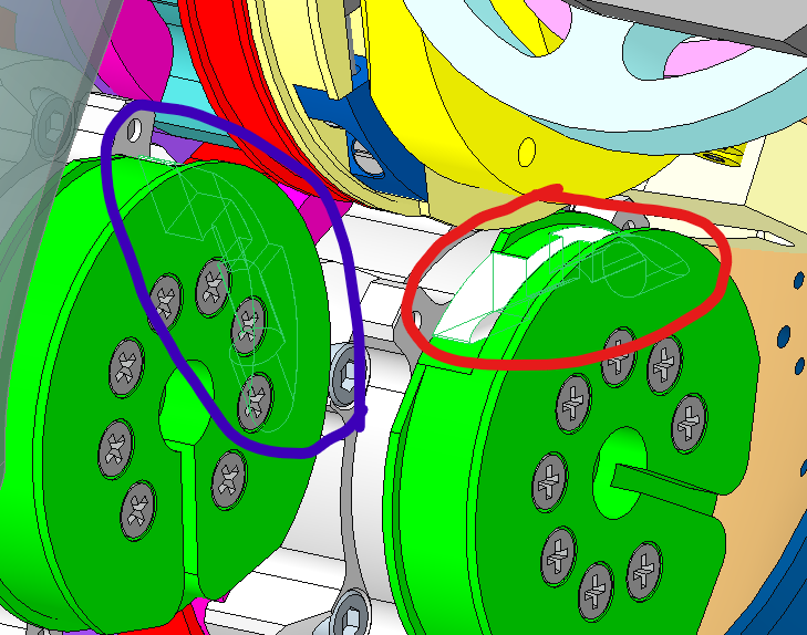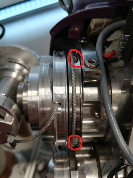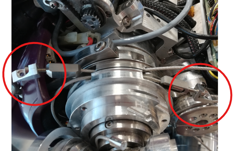 In order to access the tensioners of cables 1 and 2, you have to remove the small metal cover on both pulleys, as shown below, by unscrewing the M2x5 screw holding them: