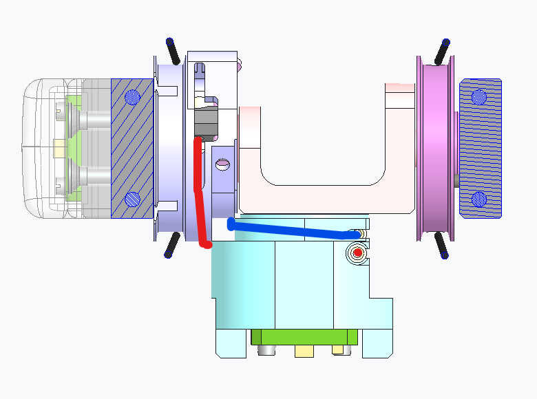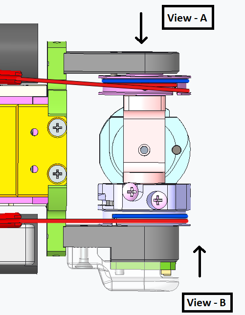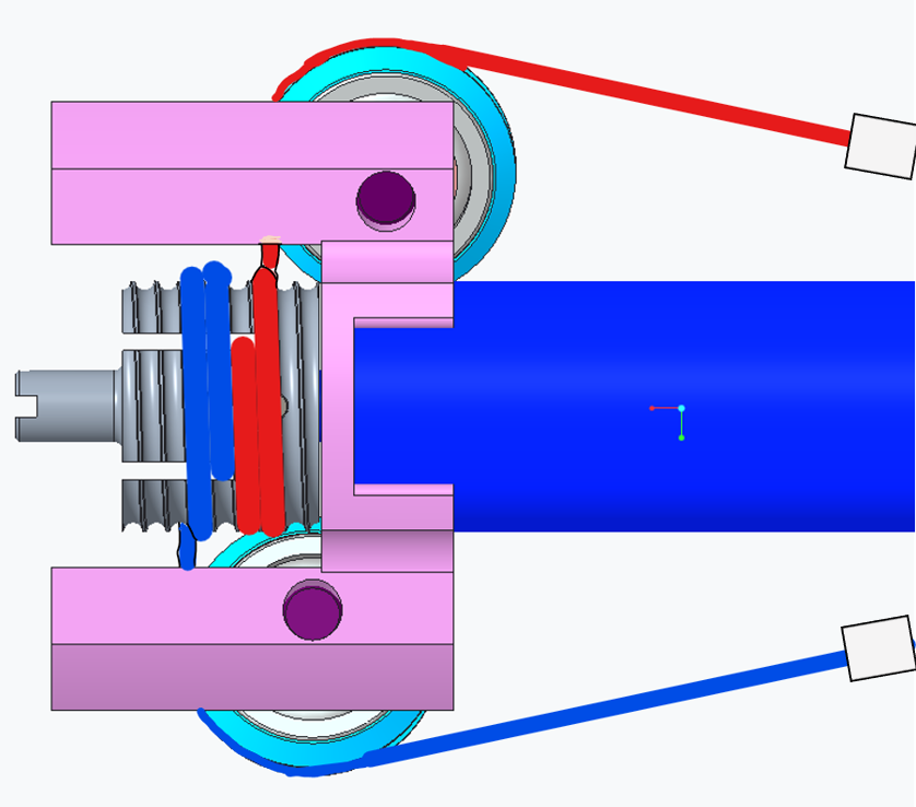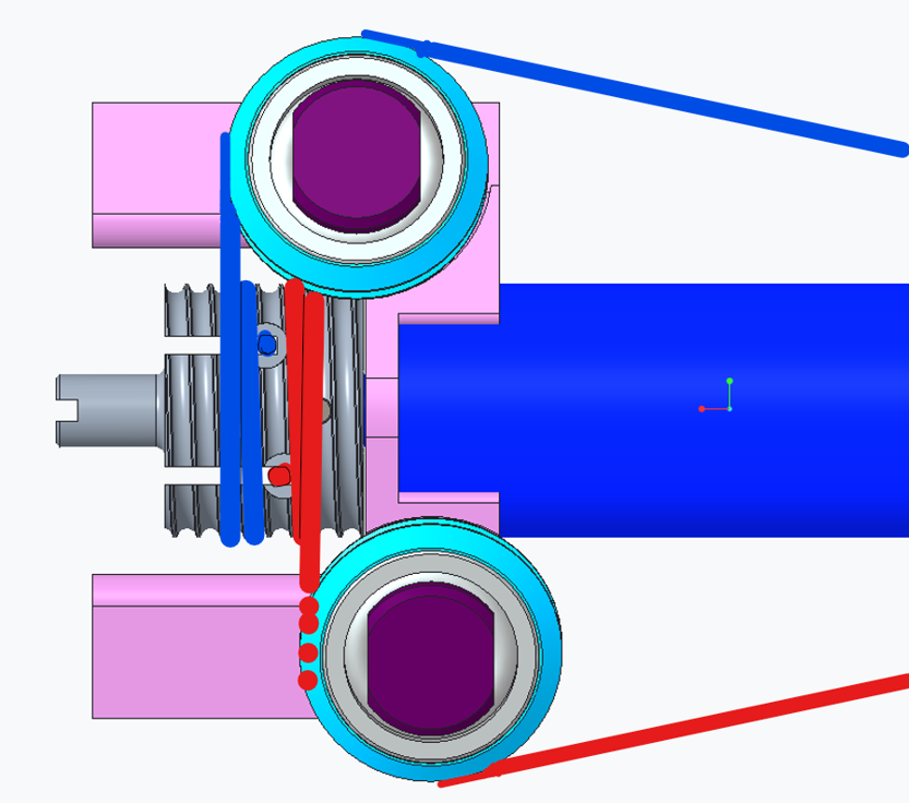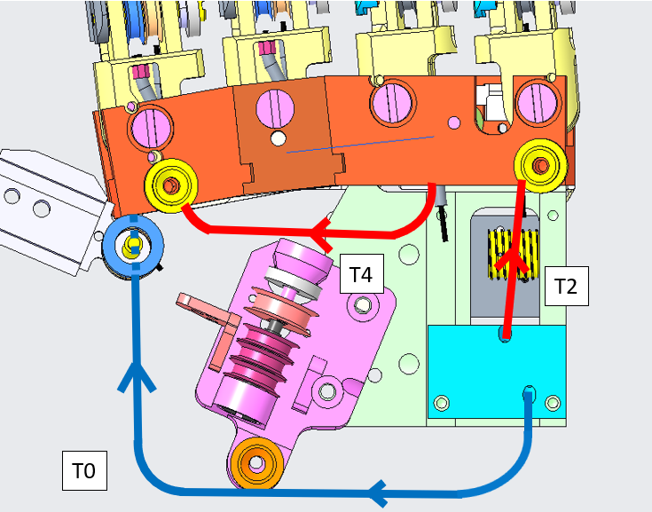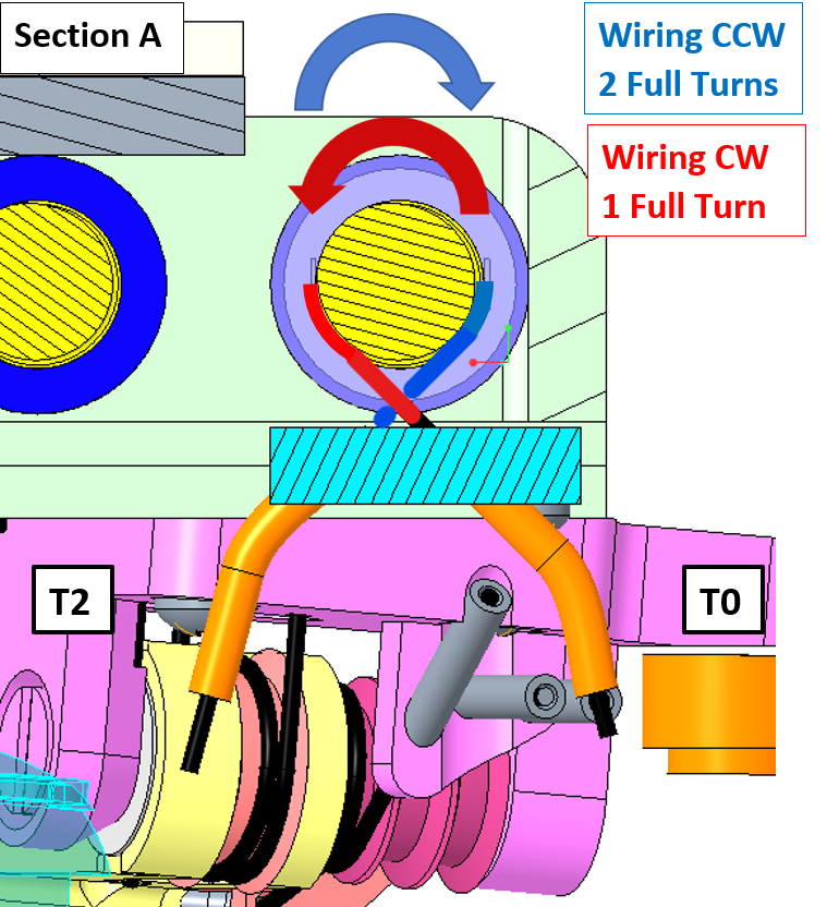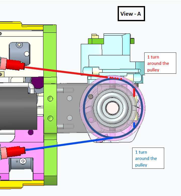 STEP 5: start wiring: 2 Full Turns (blue) CCW around the pulley and it gets out into tube T2 1 Full Turn (red) CW around the pulley and it gets out into tube T0. |