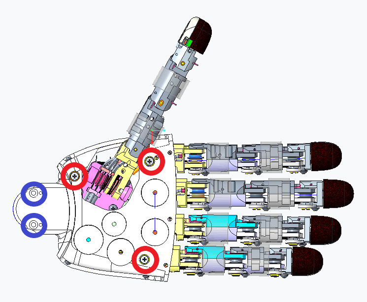 STEP 1: The only way to start correctly this wiring is to remove the palm. Please remove the 3 screws M2x6 (circled in red) inside the palm and the 2 screws M2x4 (circled in blue) at the base of the wrist. |