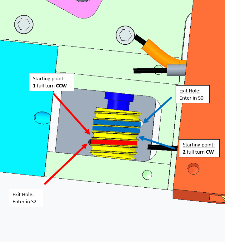 STEP 3: DO 1 turn around the pulley CCW to go into S2 ball-bearing side 2 turns around the pulley CW to reach S0 motor side !!!TIP: You may find convenient to remove the plate to round the cable around the pulley more easily. |