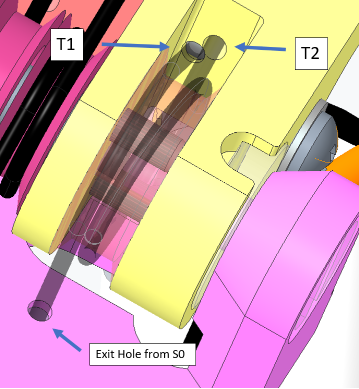 STEP 5: The cable from S0 goes directly into hole T1. The cable from S2 makes 1 FULL TURN around the pulley before going into T2. |