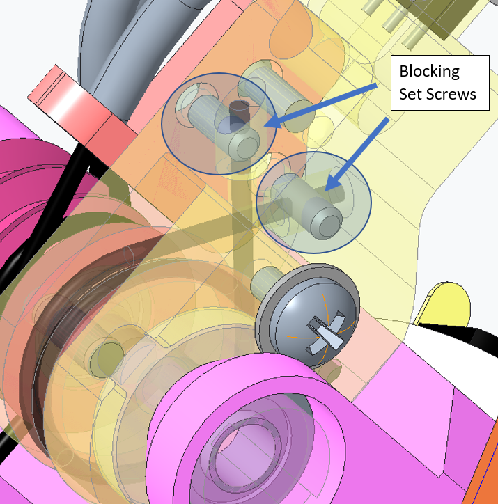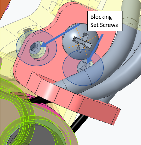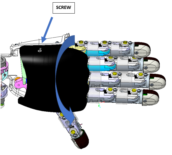 STEP 8: Before starting to wire the base of the index finger it is really important to block the cable at the base of the pinkie finger - in this way we wont unintentionally untwine the wiring at the level of the motor pulley. 1. Insert the set-screw onto the pinkie finger and tighten it.. |