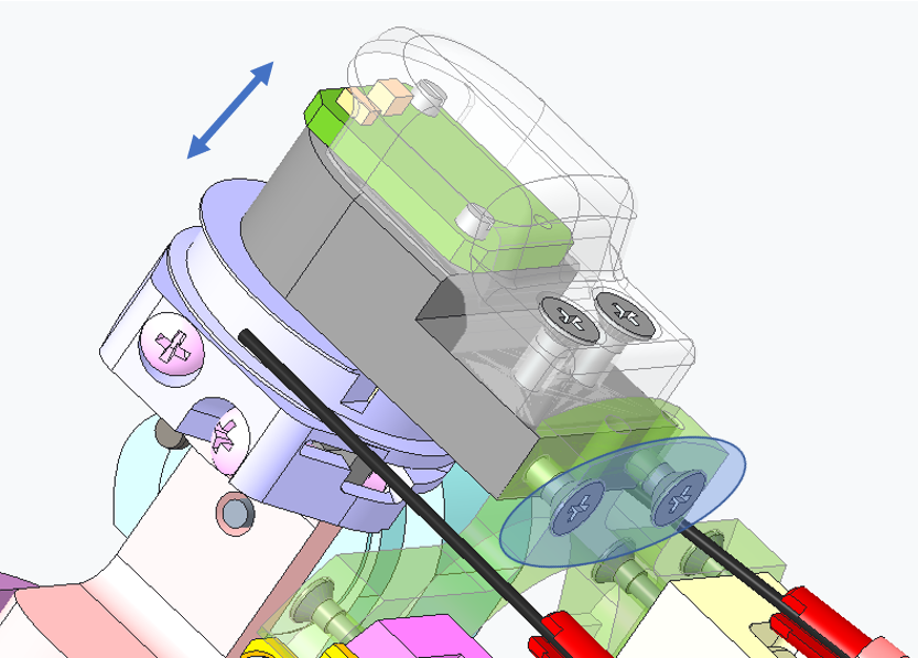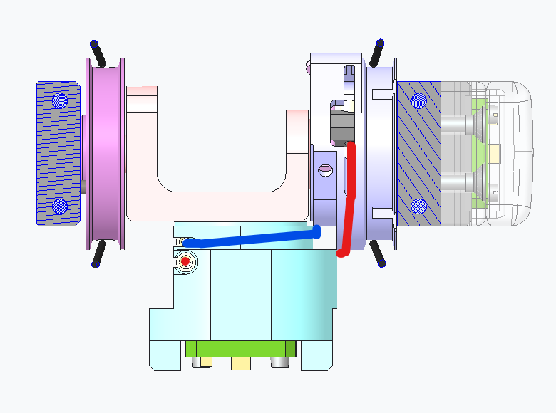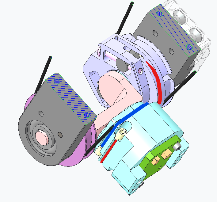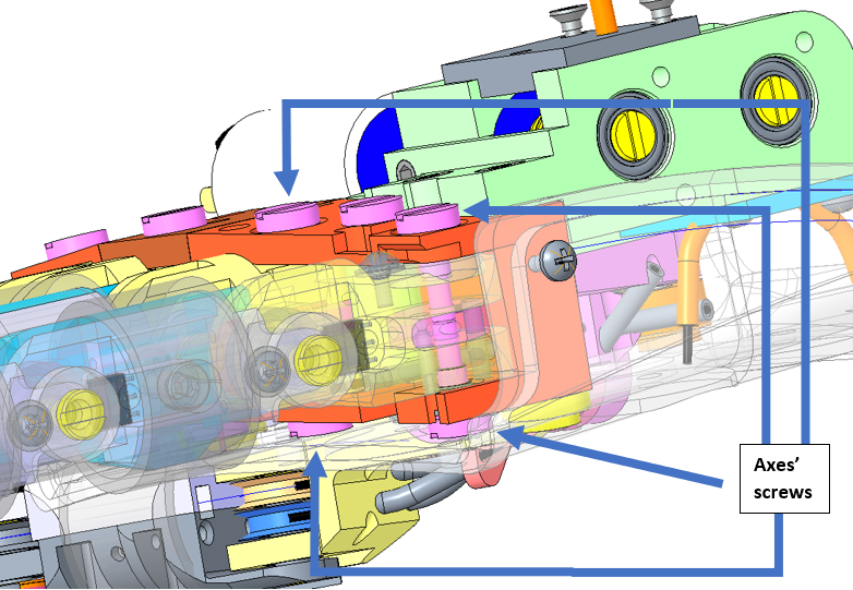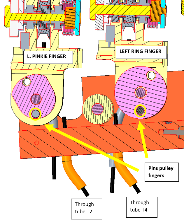STEP 9: As for pinkie and ring fingers: 1. untighten the 2 axes screws in order to be able to move the pink (color) pulley sideways around its PIN 2. Pass the cable coming from T4 (red) inside the pulley hole. |