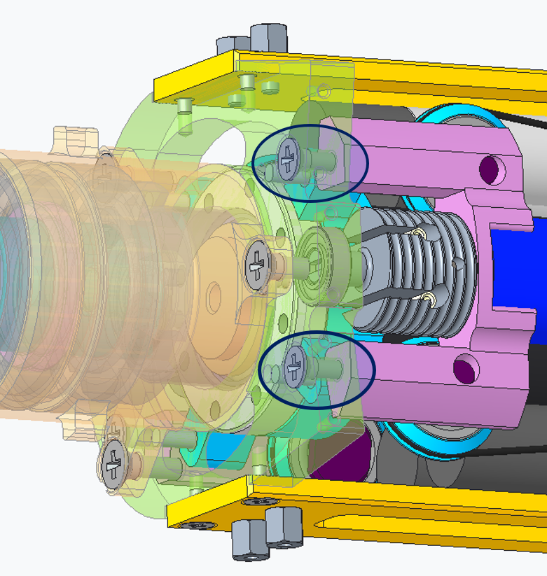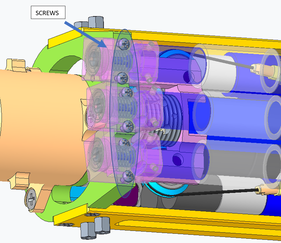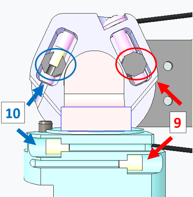 STEP 9: Remove the tie wrap at the level of the motor wrist, for let's say cable 3. Open one side of the tensioner and start putting the ring, then the threaded piece of the tensioner, finish by screwing the ring onto the threaded piece. Do the exact same for the cable 1. |