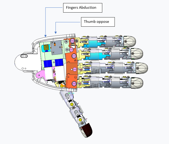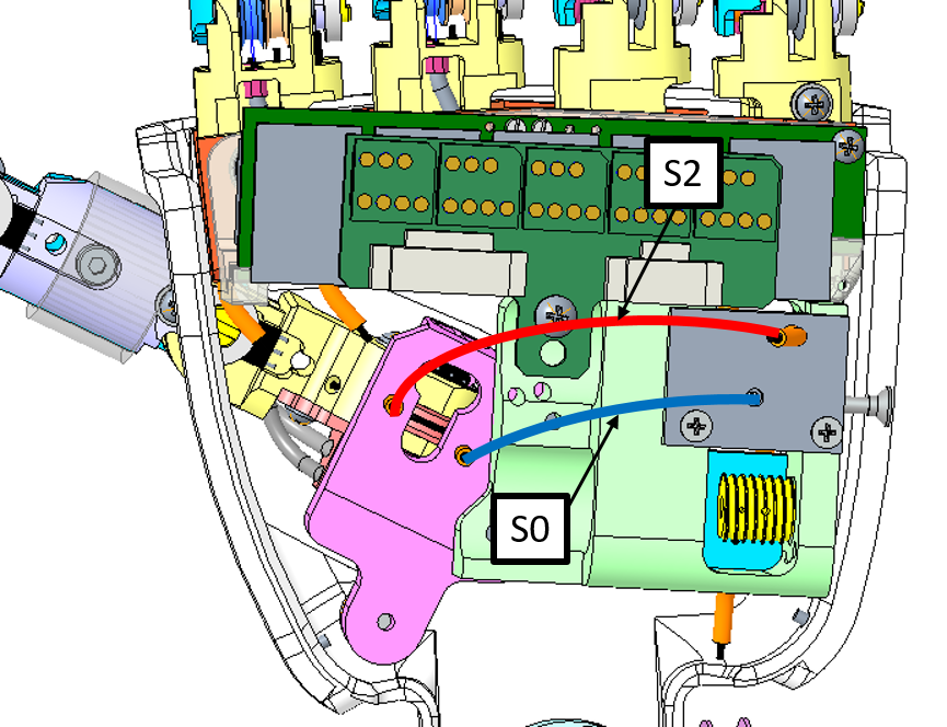 STEP 2:The only way to start correctly this wiring is to remove the palm. Please remove the 3 screws M2x6 inside the palm (circled in red) and the 2 screws M2x4 (circled in blue) at base of the wrist. |