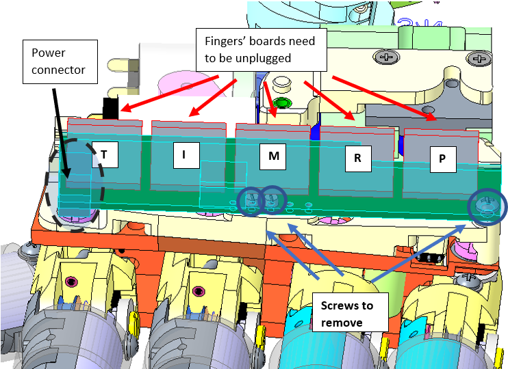STEP 6b: 1. Unplug every single chipset from the main board !!!TIP: Please write down with a marker the initial of the finger chipset you unplug - it sometimes a bit messy when remounting everything to find out which chipset is for which finger. 2. remove the power connector 3. remove the 3 screws (2 M1x5 and 1 M1.6x6) 4. With caution please remove the MAIS Board - on the bottom side of the board there is an inductor that sometimes got broken when removed carelessly. |