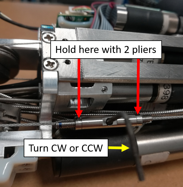 | !!!TIP: you may find useful to first block one side and afterwards use a plier to exert a strong pulling of the wire to tense this other side of the cable and block it. Repeat the the same process on the other side. FINAL CHECK: If the cabling is correct, when rotating the motor CW the finger should open (hand wide open) |