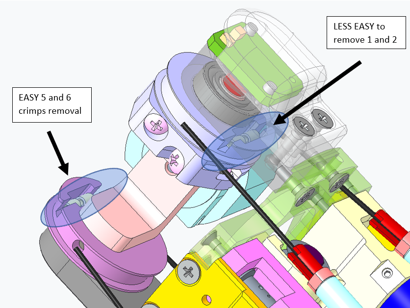STEP 4: At the level of the wrist pulley, just remove the broken cable and replace it : EASY for cable 5 and 6 BUT LESS EASY for cable 1 and 2, because you need to remove the mechanical part preventing you from inserting and removing the head crimp. To do so, just remove the 2 screws M2x6 and slide the block to retrieve and replace the head crimp. Once done, put back on place the block and the 2 screws. |