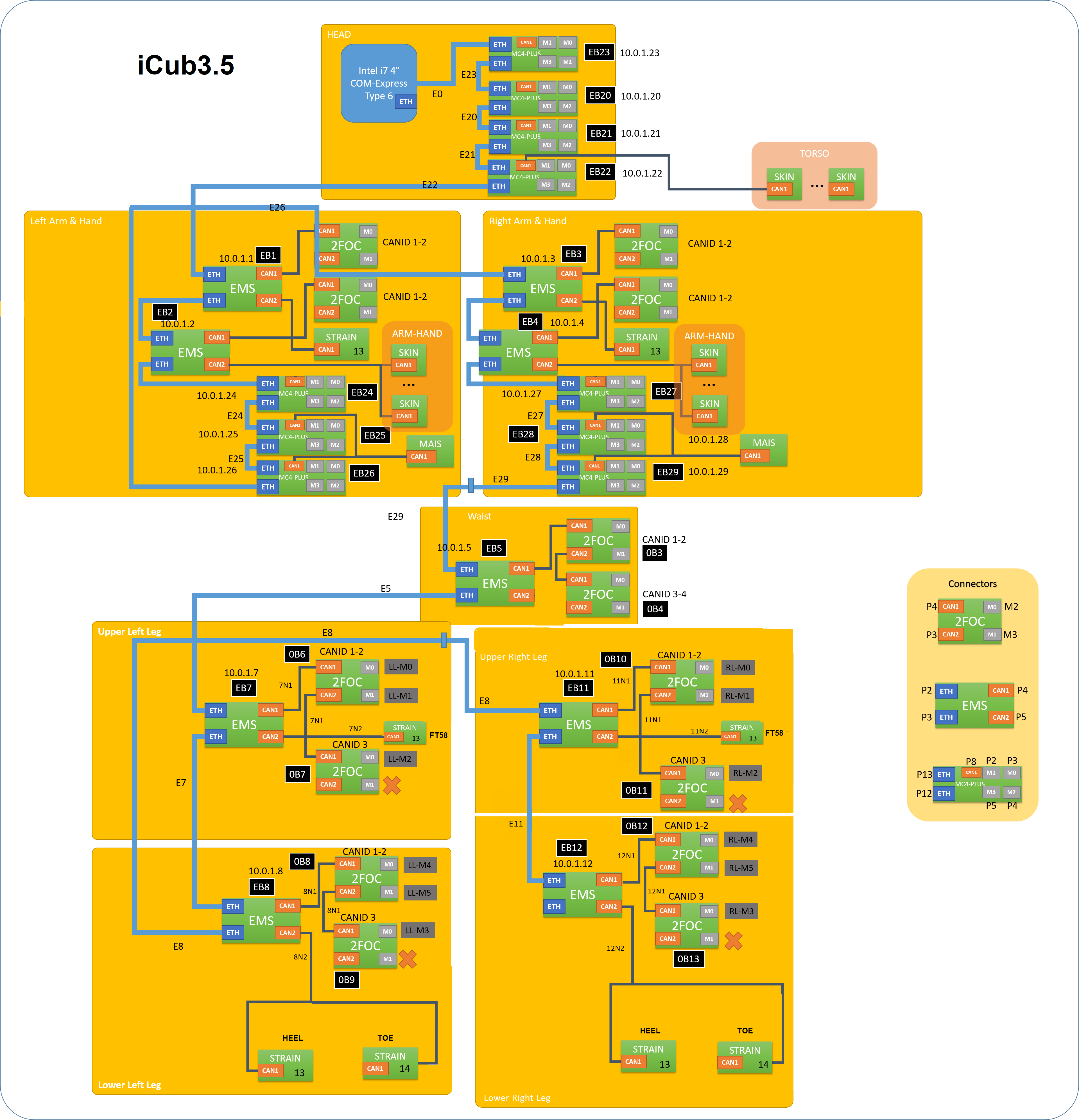 Icub3 x iCub 3.x Wiring The system architecture of iCub 3 is depicted in the following image: Warning The documentation is still incomplete Logic and Harness iCub 3.0 E0.0 Full Robot iCub 3_Upperbody Logic_0.0.0 iCub 3_Upperbody Harness_0.0.0 iCub 3_LowerBody Logic 0.0.2 iCub 3_LowerBody Harness 0.0.0