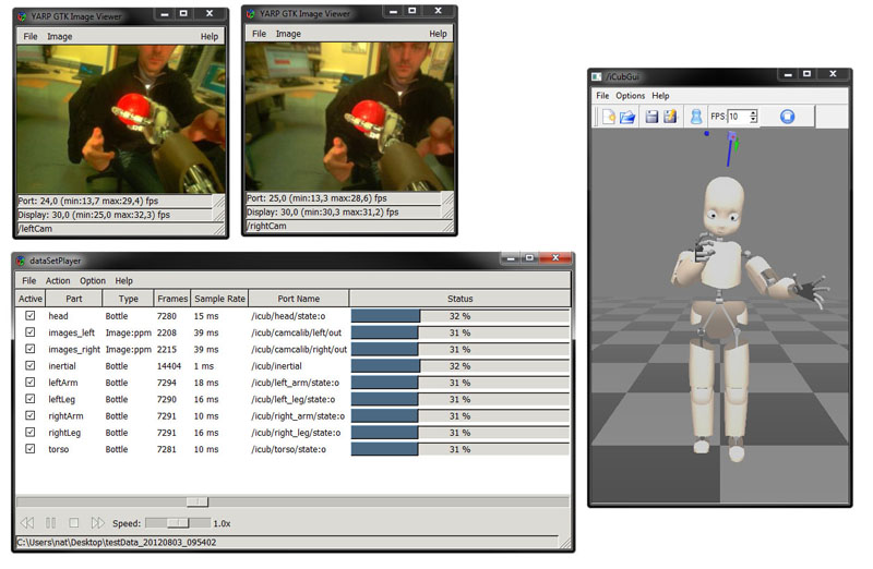 You can also use the dataSetPlayer to replay a recorded sequence. This will reproduce all the sensory information available on the real robot during a simple experiment. Follow the instructions at https://yarp.it/latest/group__yarpdataplayer__example.html.