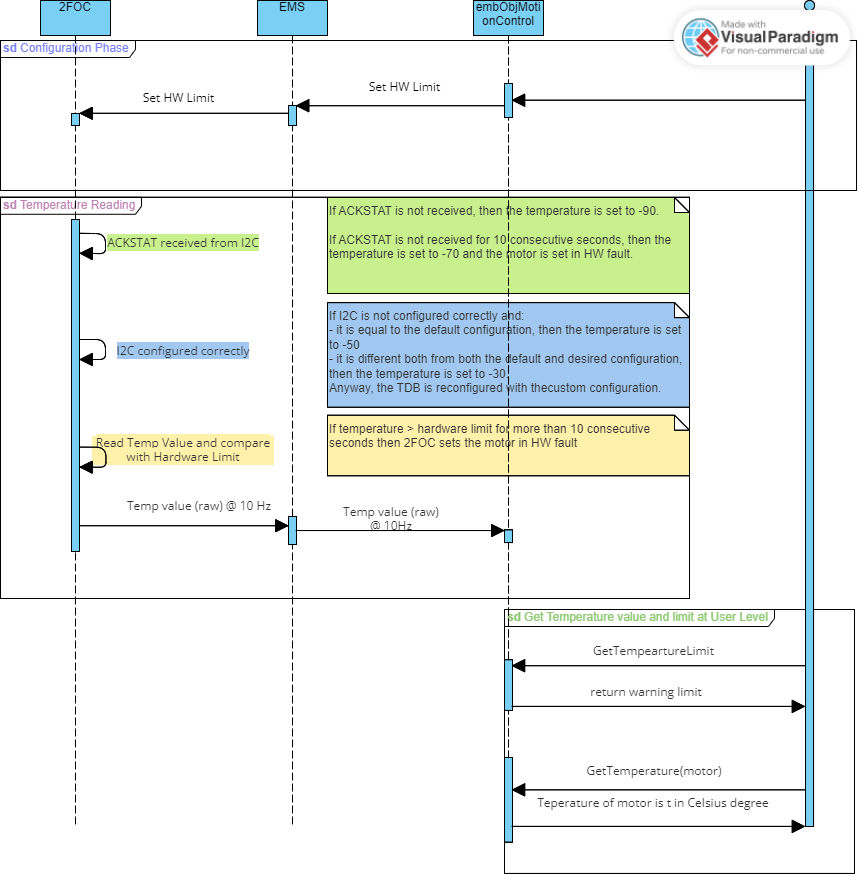 The TDB board sends 3 bytes on the I2C bus: the temperature value (2 bytes) and its configuration (1 byte). The 2FOC verifies mainly the configuration byte.