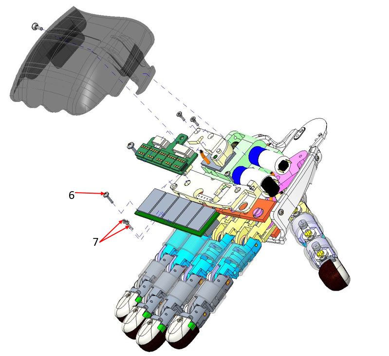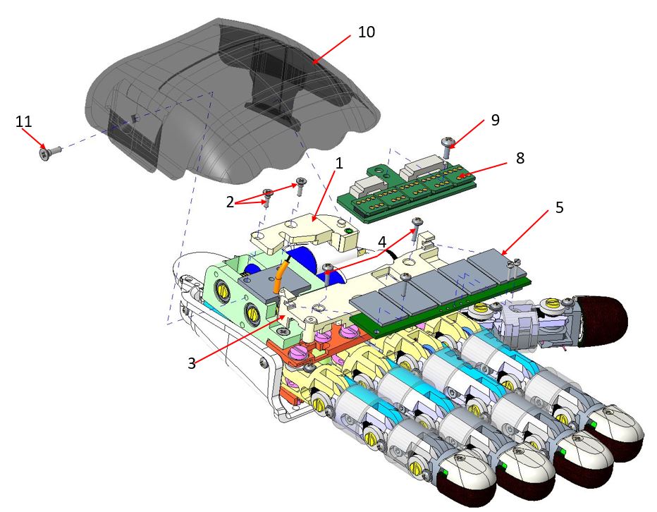 First of all you need to know that you will be in a situation where you will have to disassemble the components to replace and disconnect the Corn and FTC boards in order to move them and leave the workspace free as much as possible. Once this is done the first piece to be mounted will be the rc_IIT_011_g_016 or the rc_IIT_011_g_017 (right or left hand) as shown in the video. All this because you will find yourself in the condition in which you will have to pass the piece between the cables (tendons) that move the thumb. This explanation is the same for both hands