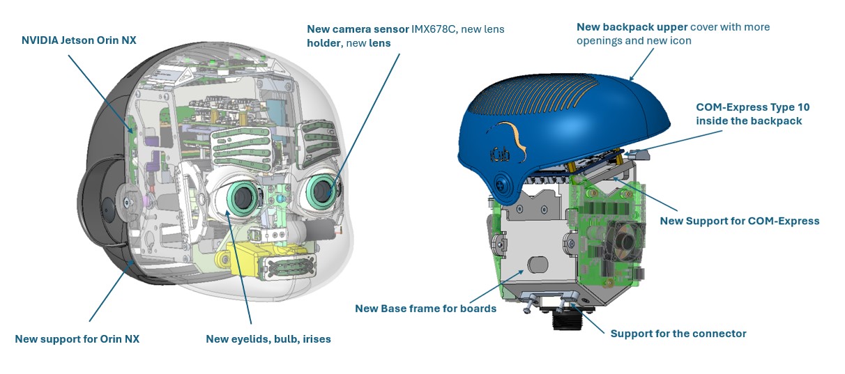 This upgrade kit is meant to update the head with new eyes composed by high-resolution cameras, bigger FOV lenses, new GPU, new accomodation for the COM-Express in the backpack, new design for the upper cover of the backpack.