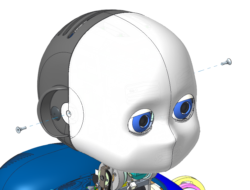 The RealSense holder can be mounted on the top of iCub head by replacing two side screws fixing the face cover, and in the kit are included and USB Type-C cable, screws and cable ties. The kit does NOT include the RealSense. It is recommended to replace the short cable included in the RealSense retail package with the longer one provided with the upgrade kit.
