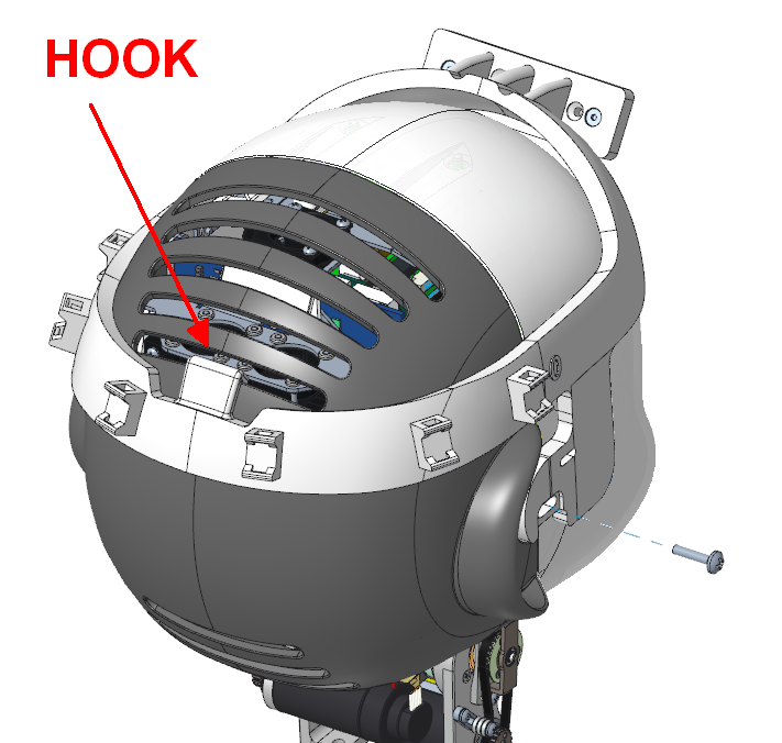 - Second step, fix the holder IG_027_P_010 with the respective screws V4-16--_-_ISO7045_CZ as shown in the image, and fix the hook to the backward cover air vents.